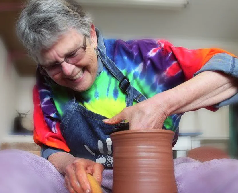 Virginia continued wheelwork until the 1980’s when she became fascinated with extruded forms at Mission Clay in Fremont, California. As a resident sculptor she worked with eight-foot tall cylindrical sewer pipes. She began a Sentinel Guardian series, revisiting it through the years. “Passages”, a sculpture from that series, was installed in the California San Bernardino County Government Center (1984). She’s had pieces in the Sam Maloof Sculpture Garden in Southern CA.